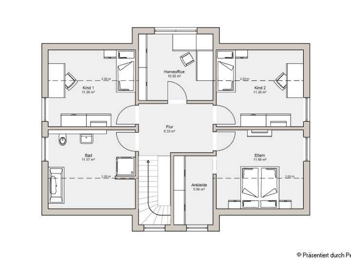 Das Dachgeschoss bietet zwei große Kinderzimmer, ein Home-Office und das Eltern-Schlafzimmer mit separater Ankleide. Das Badezimmer wird aufgrund der Größe und Aufteilung schnell zur individuellen Wellness-Landschaft.