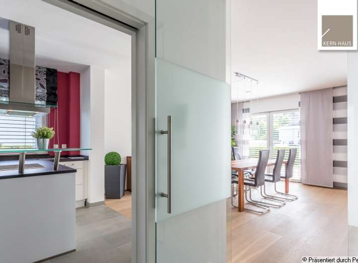Im Erdgeschoss befindet sich der helle Wohn- und Essbereich mit direkt angrenzender Küche. Durch einen Flur gelangt man in das Gästezimmer. Praktisch ist das direkt angrenzende Duschbad für den Gast. Das Lifestyle-Haus Aura ist ein Haus für Gartenfreunde: In diesem Haus kommen Sie aus allen Räumen im Erdgeschoss direkt in den Garten.