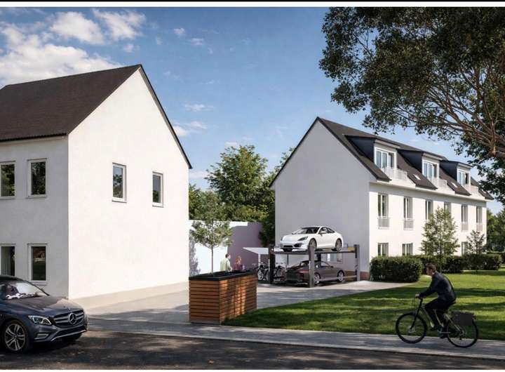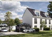 Gartenterrasse. Massive Bauweise, dreifachverglaste Fenster mit elektrischen Rollläden, moderne Haustechnik mit Wärmepumpe und Fußbodenheizung, hochwertige Sanitärmarken von Geberit und Hansa sowie frei wählbare Bodenbeläge sorgen für hohen Wohnkomfort. Im Dachgeschoss befindet sich neben einem der modernen Badezimmern ein exklusiver Ankleideraum. Zum Reihenhaus gehört ebenfalls ein Duplex-Stellplatz, bestehend aus zwei Pkw Stellplätzen
