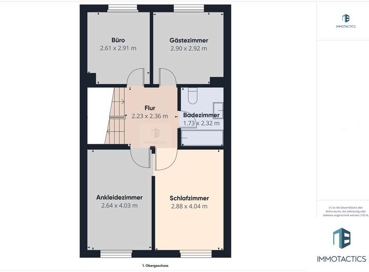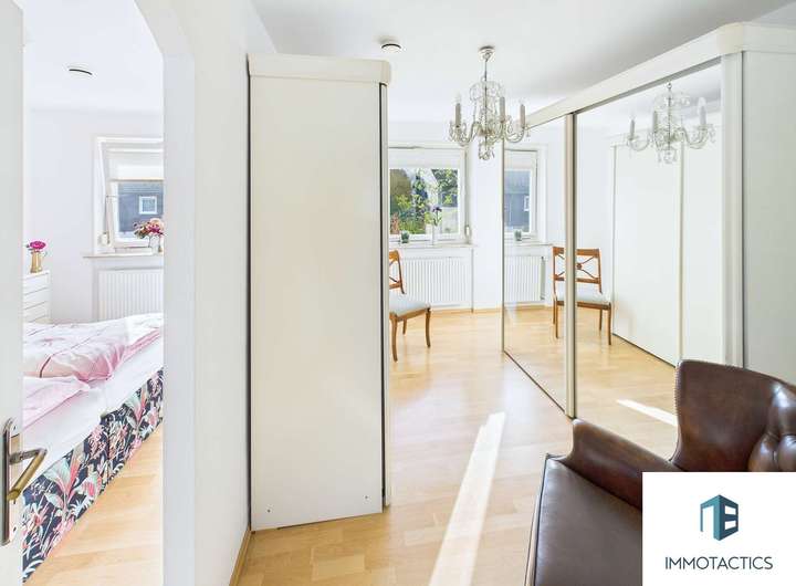 Eine Holztreppe führt nach oben, wo weitere Räume durch ihre Flexibilität überzeugen. Das derzeit offen verbundene Schlaf- und Ankleidezimmer wirkt wie eine zusammenhängende, ruhige Suite – lässt sich aber bei Bedarf wieder in zwei Zimmer trennen. Daneben bieten zwei weitere Räume vielseitige Nutzungsmöglichkeiten für Gäste, Kinder oder Büro. Das helle Badezimmer auf dieser Etage verfügt über eine Wanne mit Duschwand.