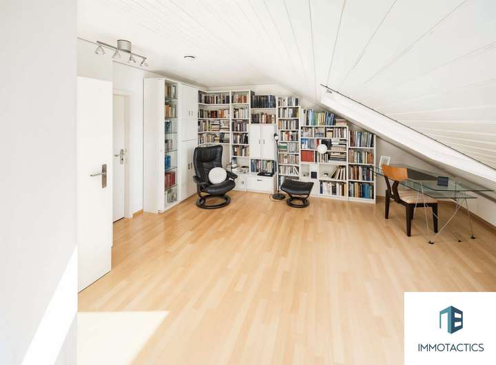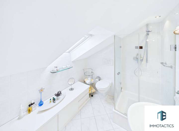 Im Dachgeschoss befindet sich ein weiteres großzügiges Zimmer mit direktem Zugang zu einem eigenen Tageslichtbad, das mit einer großen Dusche ausgestattet ist. Dadurch eignet sich diese Ebene ideal als Gästebereich, Studio oder privater Rückzugsort.