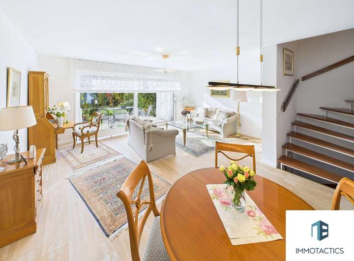 Im Erdgeschoss bildet das großzügige Wohnzimmer den Mittelpunkt des Hauses. Große Fensterfronten mit elektrischen Rollläden öffnen den Raum zur sonnigen Terrasse mit Markise und dem liebevoll angelegten Garten, der 2018 umfassend neu gestaltet wurde. Die Wohnräume sind optimal nach Süden ausgerichtet, wodurch sowohl Terrasse als auch Garten den ganzen Tag über viel Sonnenlicht erhalten. Das Gartenhäuschen bietet genug Stauraum für Gerätschaften.