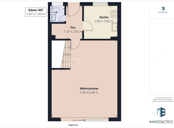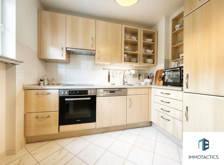 Der Wohnraum wurde 2018 mit einer umweltfreundlichen Landhausdiele ausgestattet, die dem Bereich eine warme, natürliche Atmosphäre verleiht. Die angrenzende Küche ist gut geschnitten, bereits mit einer 2017 erneuerten Einbauküche ausgestattet, wobei hier hochwertige Marken-Elektrogeräte eingebaut wurden und bietet ausreichend Platz. Ein Gäste-WC mit Tageslicht ergänzt diese Ebene.
