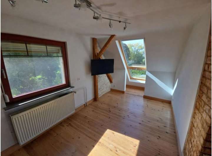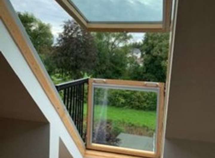 Im Obergesschoß ist ein großes, renoviertes Schlafzimmer mit schicken Cabrio Dachfenster und Minibalkon.