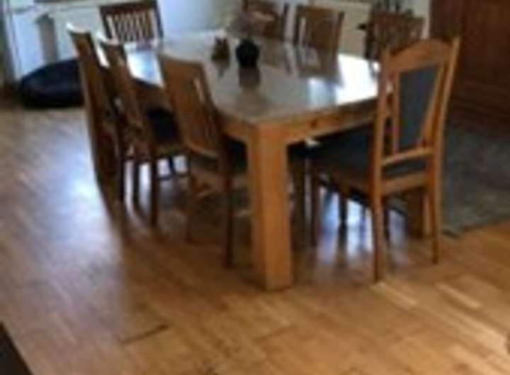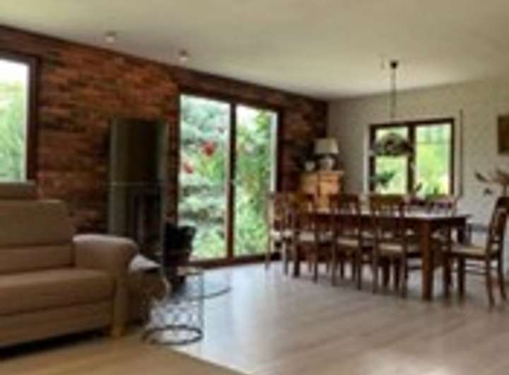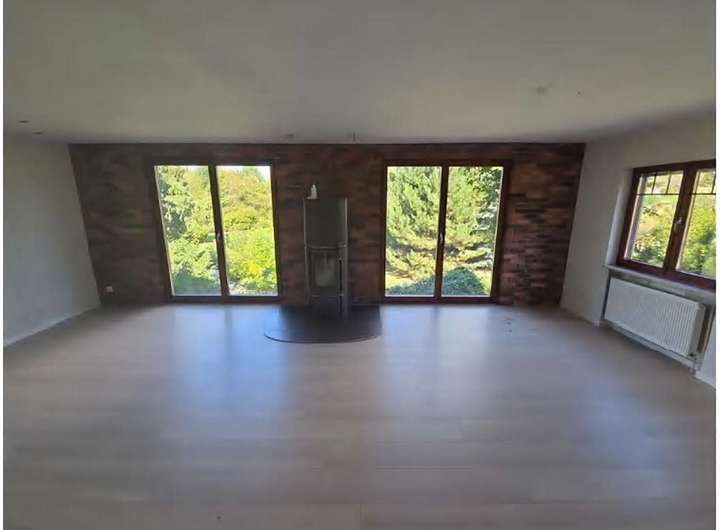 Im Erdgeschoß finden Sie ein großes Wohnzimmer mit Panoramafenstern und einem wasserführenden Kaminofen. Weiterhin eine Einbauküche aus 2017, offenes Esszimmer sowie ein Badezimmer mit Badewanne und Dusche.