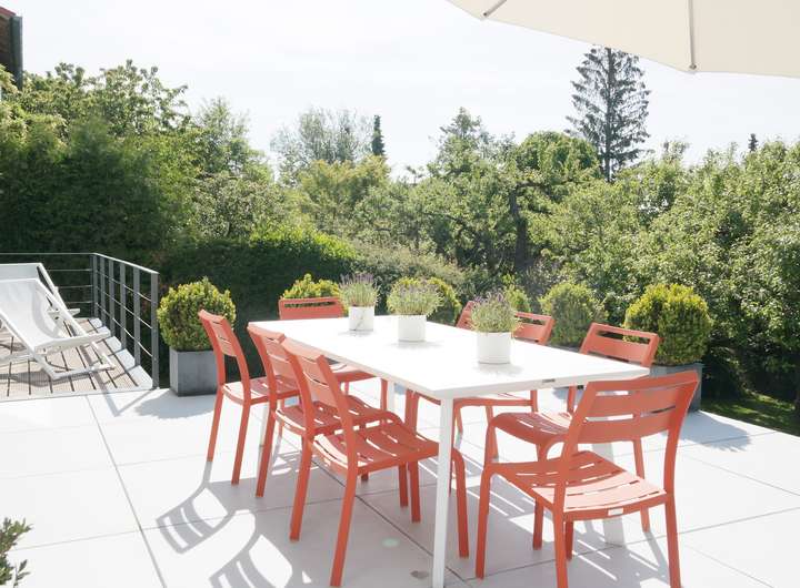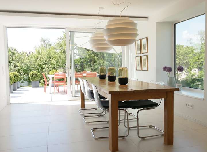 Der offene und moderne Wohnbereich im Erdgeschoss besticht durch die großen, bodentiefen Fensterverglasungen mit Blick und Zugang über die großzügige Terrasse, in den Garten mit altem Baumbestand. Unterstützend zur Gartenpflege wurde im Garten ein Mähroboter installiert. Alle nach Süden ausgerichteten Fenster wurden mit elektrischen Raffstoren ausgestattet. Angrenzend an den offenen Wohnbereich befindet sich die hochwertige, durch einen Schreiner angefertigte Einbauküche samt allen elektrischen Geräten. Des Weiteren bietet ein separates Zimmer die Möglichkeit sich einen Arbeitsbereich auf dieser Wohnetage zu ermöglichen. Auch für Vorräte o.ä. steht angrenzend an das Gäste-WC ein Abstellraum, mit Fenster zur Verfügung. Über den großzügigen, offenen Treppenaufgang gelangt man in die Schlafetage mit zwei Kinderzimmern nebst Kinder-Bad, einem weiteren Arbeits- oder Kinderzimmer, sowie den Elternschlaftrakt samt Ankleide und großem, modernen Tageslichtbad mit Badewanne und bodentiefer Dusche. Beide Kinderzimmer sind ebenfalls nach Süden ausgerichtet und verfügen über großzügige Schiebefenster. Der Elternschlafbereich verfügt über einen Südbalkon mit bodentiefen Schiebefenstern.