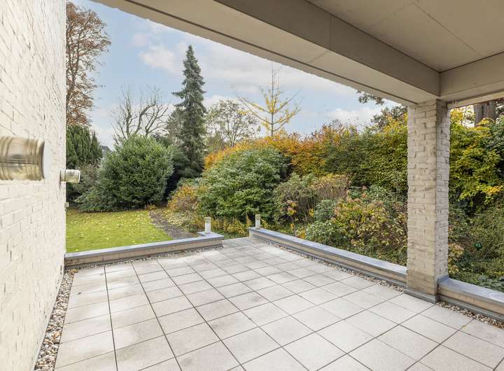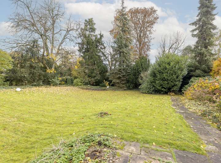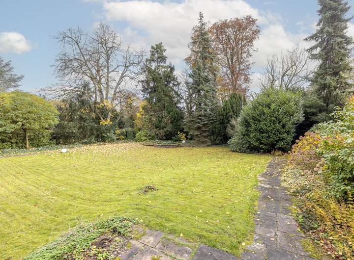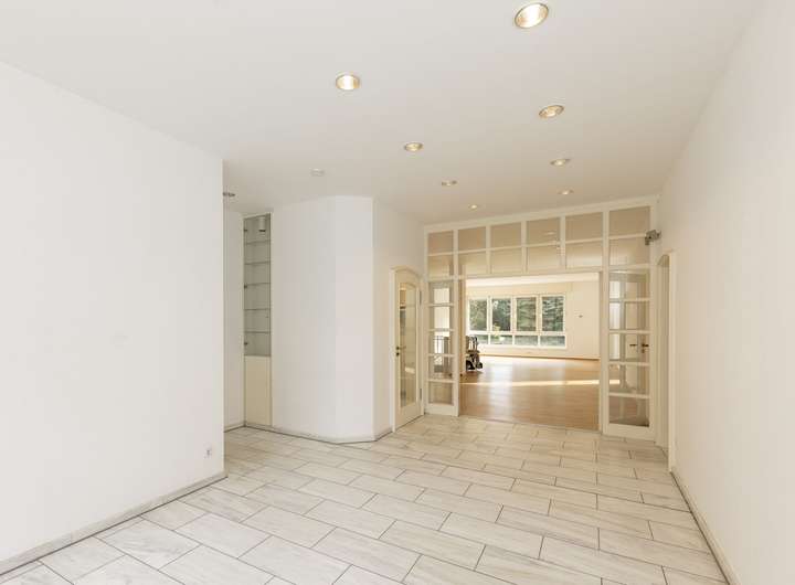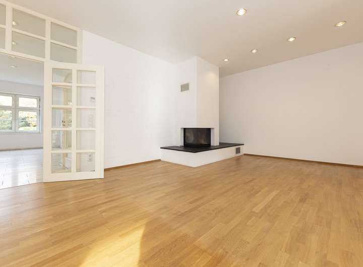 Eine doppelflügelige Tür öffnet den Zugang zum weitläufigen Wohnbereich – dem Gartenzimmer – mit Möglichkeiten eine Bibliothek und somit einen gemütlichen Lesebereich direkt am Kamin einzurichten. Dieser Raum bietet zudem die Möglichkeit, ein großes Wohnzimmer einzurichten und von hier aus den wunderschönen Blick in den großen Garten zu genießen. Von hier aus besteht ein Zugang zur teil überdachten Terrasse sowie zum gepflegten Garten.