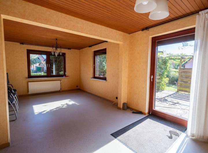 Das Wohnzimmer hat einen PVC-Boden mit darunterliegenden OSB-Platten. Dank der Fenster- bzw. Türelemente mit Richtung Süd-/Südwesten wird der Bereich mit ausreichend Tageslicht versorgt.
