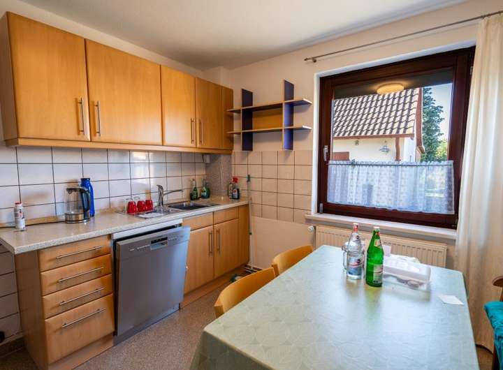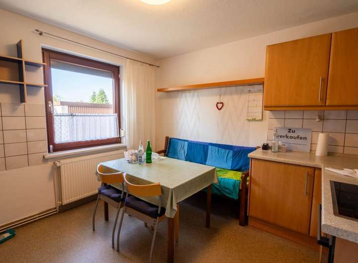 Praktisch über zwei Ecken ist die Einbauküche gebaut, sodass der Esstisch ebenfalls seinen Platz findet.