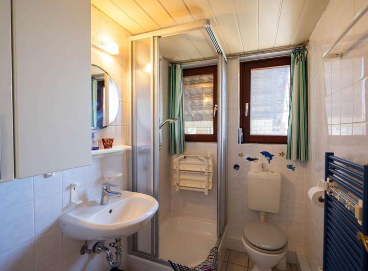 Dusche, Handtuchheizkörper und zwei Fenster kennzeichnen das Badezimmer im Erdgeschoss. Darüber hinaus kann das Zimmer mit Fenster in Richtung Straße wunderbar als Arbeitszimmer genutzt werden.