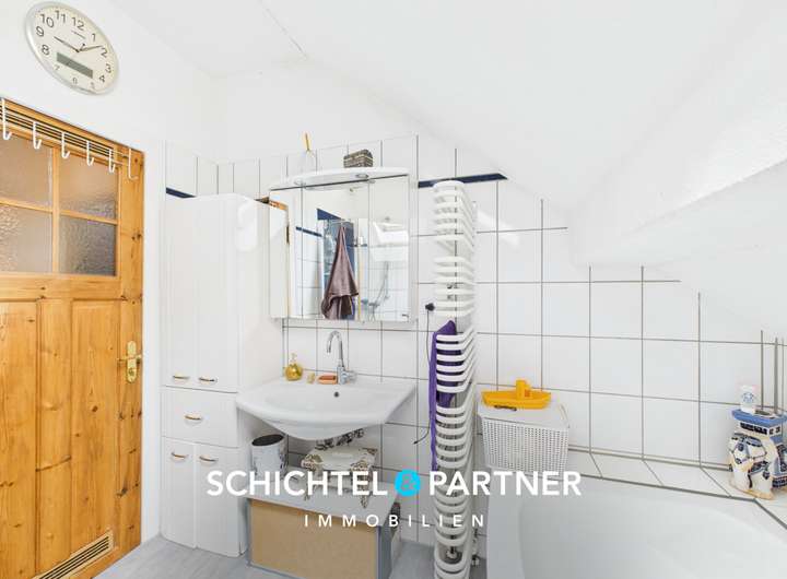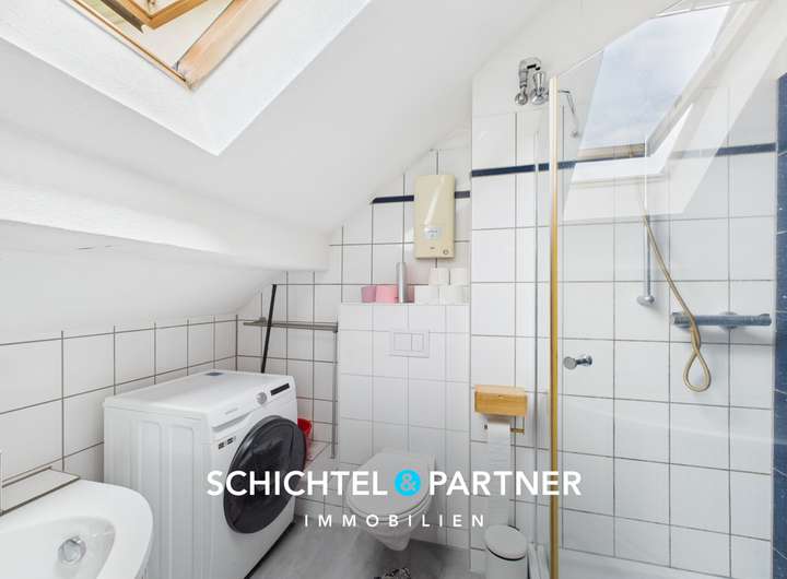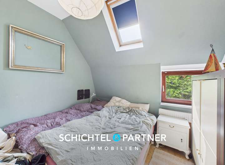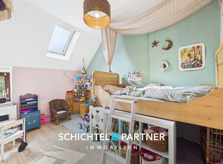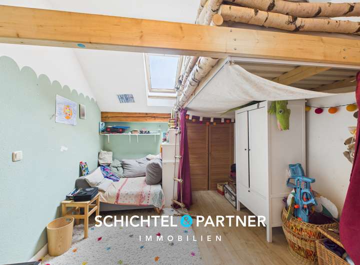 Über eine Holztreppe gelangen Sie ins Dachgeschoss mit einem Tageslichtbad, zwei Kinderzimmern sowie einem Hauptschlafzimmer. Eine weitere Treppe führt in den ausgebauten Spitzboden, der zusätzliche Abstellfläche bietet.