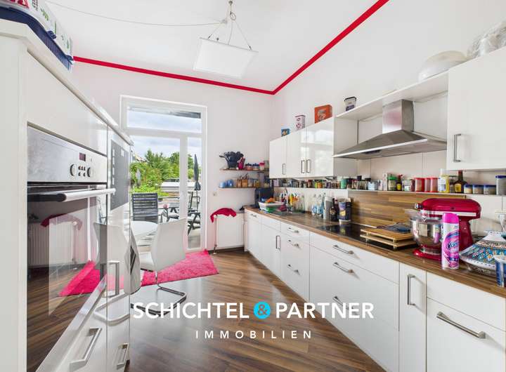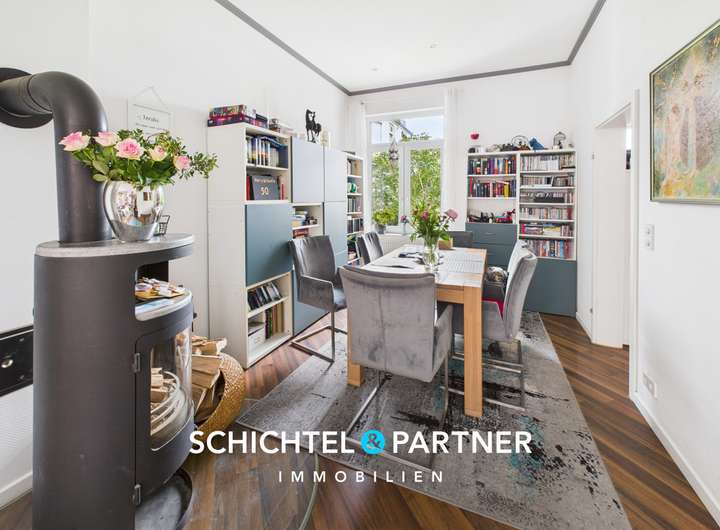 Die untere Wohneinheit erstreckt sich über das Hochparterre und das Souterrain. Mittelpunkt ist der offene Wohn- und Essbereich mit Kaminofen, ein behaglicher Raum mit viel Atmosphäre. Die angrenzende Küche überzeugt nicht nur durch ihre Funktionalität, sondern bietet auch einen direkten Zugang zum Balkon.