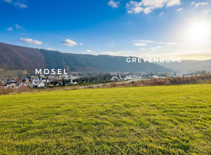 Von diesem Grundstück aus eröffnet sich ein außergewöhnliches Panorama über das Moseltal. Der Blick reicht hinunter zur Mosel, hinüber zur historischen Grevenburg und weiter Richtung Osten nach Starkenburg, dessen Abendbeleuchtung eine besonders stimmungsvolle Atmosphäre schafft.