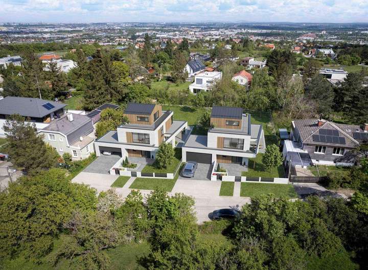 Die Umgebung ist geprägt von gepflegten Grünflächen, Wiesen und einem sanft geneigten Hang, der ein besonders angenehmes Wohngefühl vermittelt. Die erhöhte Position garantiert freie Panoramaaussichten – insbesondere auf das Stadtbild Wiens – und bietet damit einen besonderen Mehrwert für Ihr zukünftiges Zuhause.