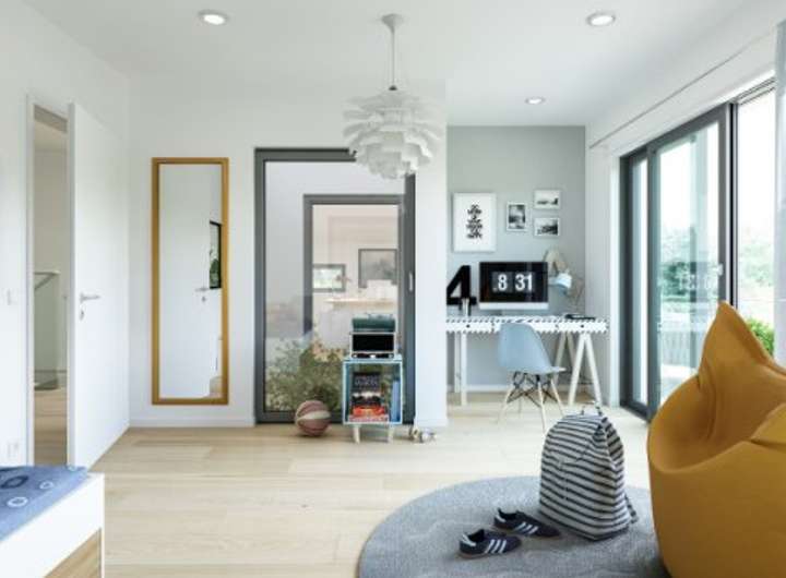 Dieses Bien-Zenker Haus, das nach Ihren Wünschen und Vorstellungen projektiert wird, verkörpert eine harmonische Mischung aus klassischen und modernen Elementen und bietet Ihnen ein echtes Wohlfühlambiente. Mit einer großzügigen Wohnfläche von 163 m² und einer intelligenten Raumaufteilung, die fünf Zimmer umfasst, ist dieses Zuhause ideal für Familien oder Paare, die Wert auf Raum und Licht legen. Das Erdgeschoss besticht durch große Fenster, die den offenen Essbereich mit Küche und den hellen Wohnraum wunderbar ins Licht tauchen. Das CONCEPT-M 163 überzeugt nicht nur durch ein Arbeitszimmer und eine praktische Speisekammer, sondern bietet Ihnen ebenfalls ein Elternschlafzimmer mit Ankleide im Obergeschoss, das Ihnen einen Rückzugsort der besonderen Art ermöglicht.