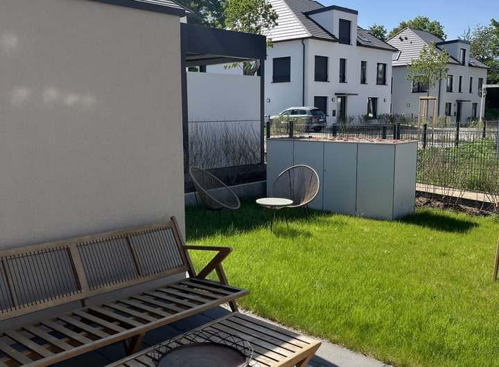 * Geschlossene Außenschränke und eine Gartenbox dienen als Stauraum für Fahrräder, Kinderwägen, Gartenzubehör und vieles mehr