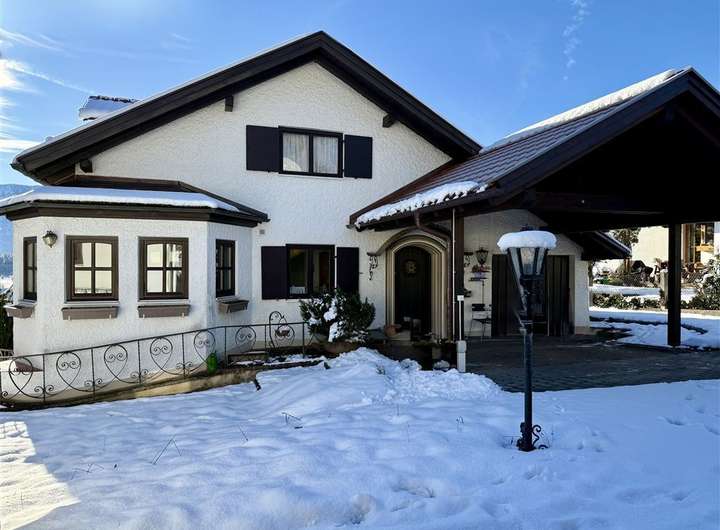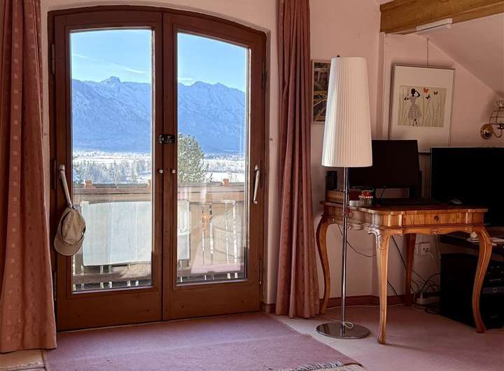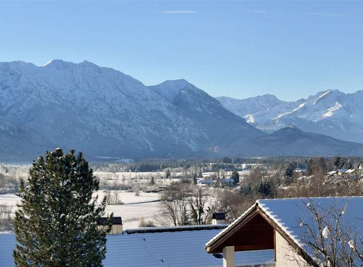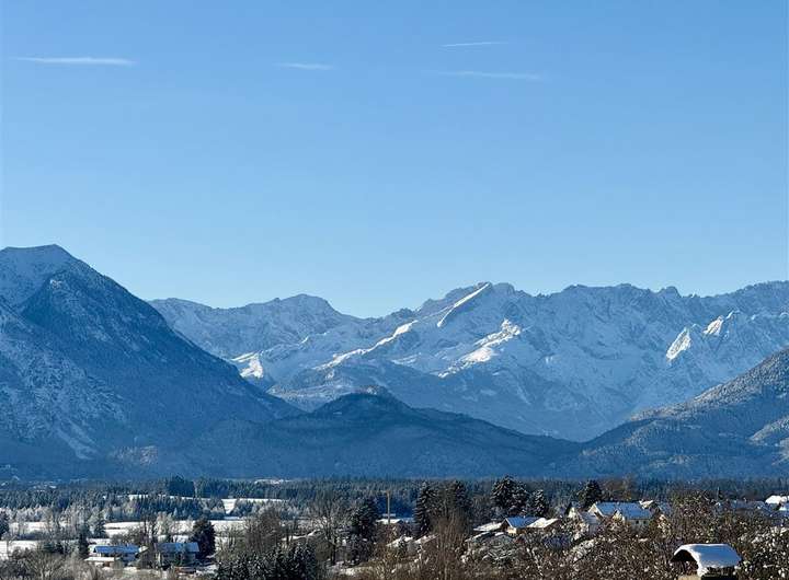 Das nach Süden ausgerichtete Grundstück umfasst 958 m2 und befindet sich in markanter Hanglage am Ende einer privaten Sackgasse. Durch diese außergewöhnlich ruhige und geschützte Lage bietet es einen unverbaubaren Blick über das Murnauer Moos bis hin zur Alp- und Zugspitze.