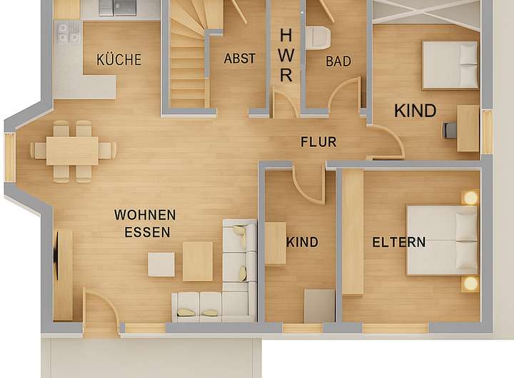 Flur, Wohnzimmer, Küche, 3 Schlafzimmer, Büroraum,