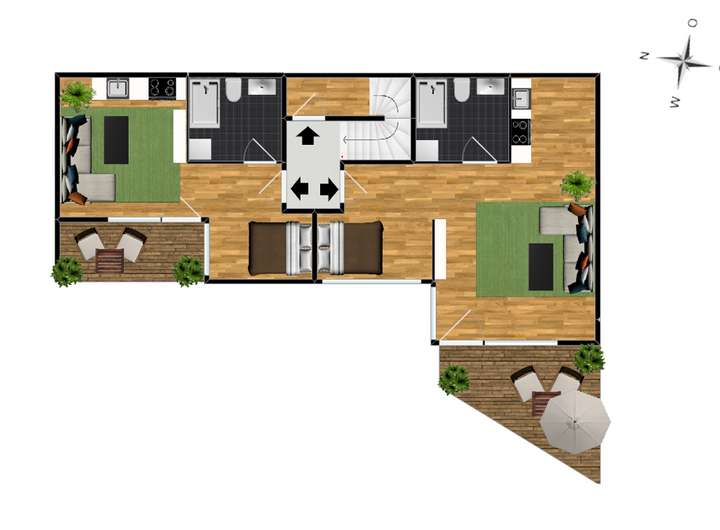 Gegenüber befindet sich das zweite Apartment, welches über einen ca. 29,8 m² großen Wohn- und Schlafbereich mit Kochzeile, ein ca. 5,5 m² großes Bad sowie einen ca. 9,8 m² großen West-Balkon verfügt.