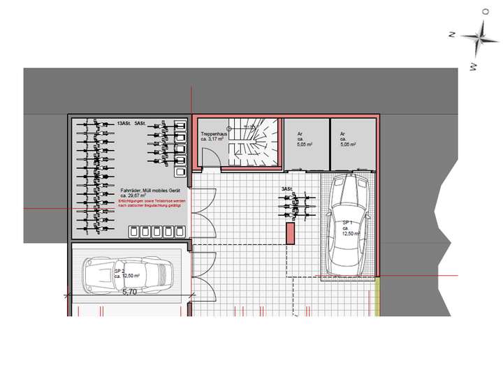 Im Erdgeschoss entsteht ein gemeinschaftlicher, ca. 30 m² großer Fahrrad- und Müllraum. Bei der genehmigten Planung sind zudem zwei Abstellräume mit einer Fläche von jeweils ca. 5,1 m², Fahrradabstellmöglichkeiten sowie ein KFZ-Stellplatz berücksichtigt worden.