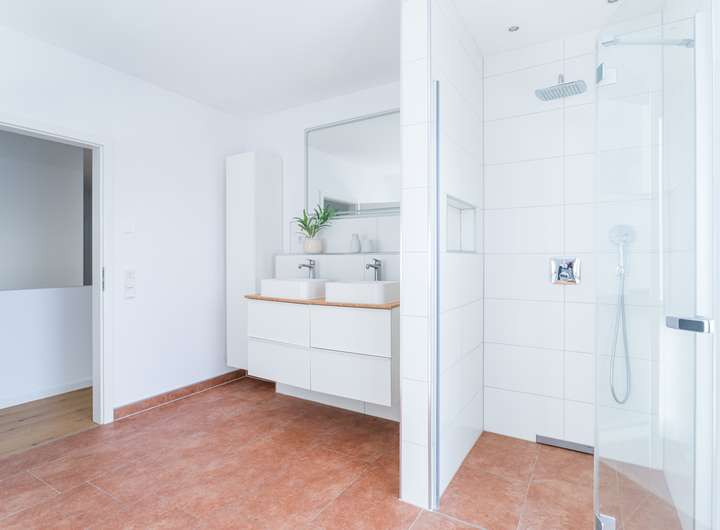 * Badezimmer mit moderner Badewanne, Dusche und einem Waschtisch.