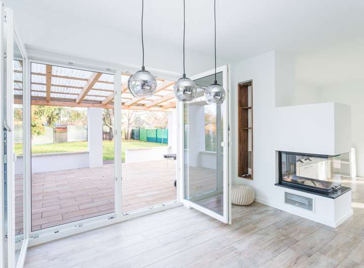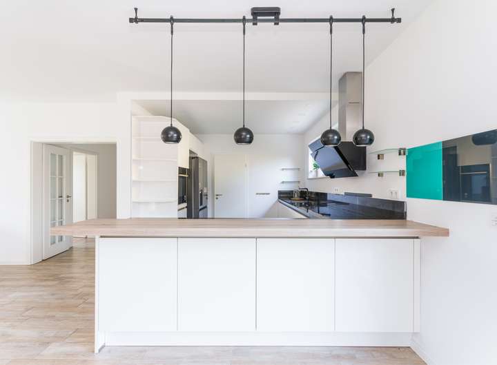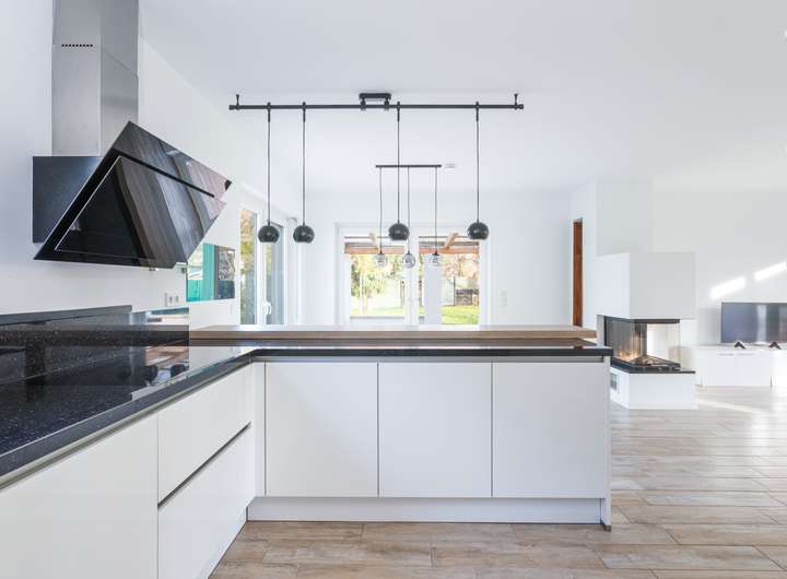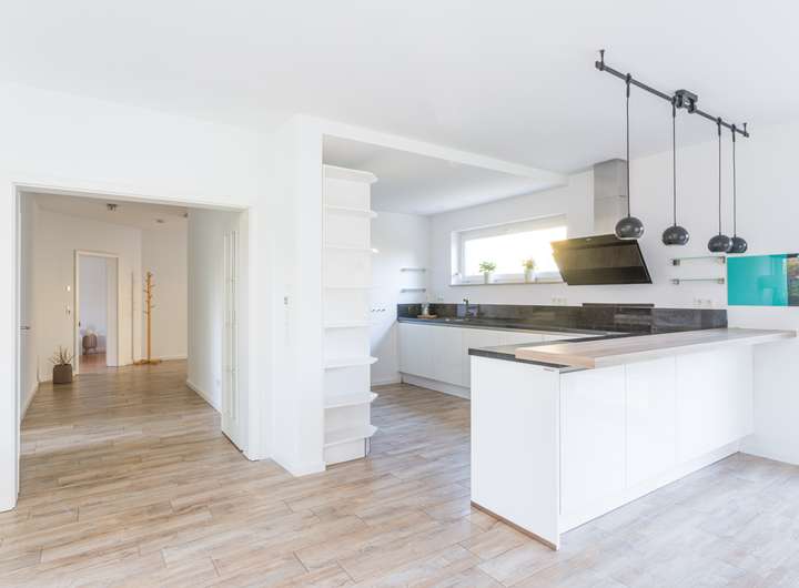 * Das 50 qm große Wohnzimmer mit Küchenbereich lässt keine Wünsche offen und führt Sie direkt auf die fast 40 qm große überdachte Terrasse. In solch einem Vorzeigeraum darf natürlich der Kamin nicht fehlen. Genießen Sie schöne Stunden am romantischen Feuer.