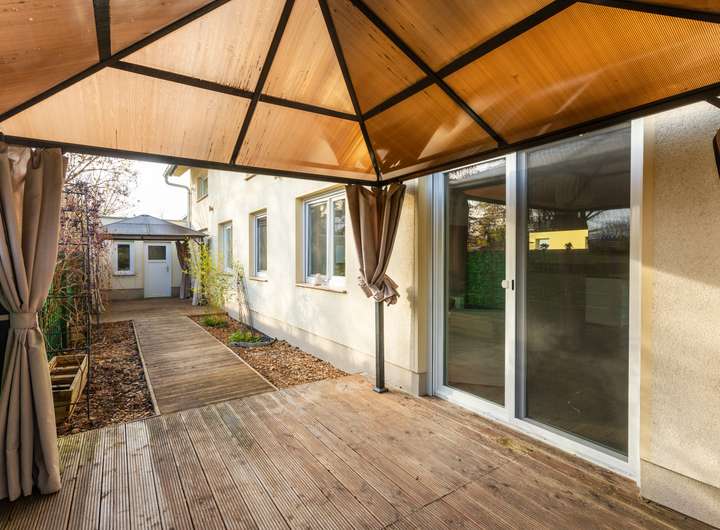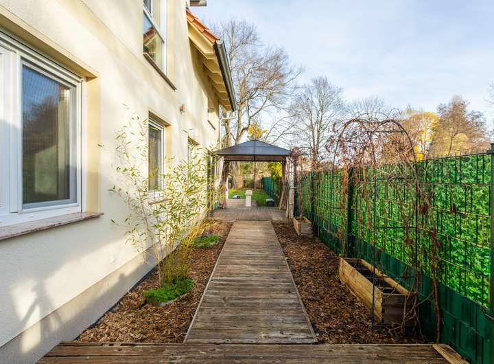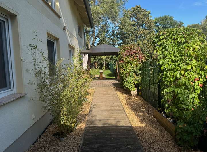 Der Rasen des Gartens wird mit einem Mähroboter gemäht. Das Haus ist sofort bezugsfertig. Das Haus liegt sicher in 2. Reihe. Das Hauptgrundstück ohne Zufahrt hat 655qm. Hinzu kommen noch 50 % der Zufahrt, welche eine Größe von 139 qm aufweist