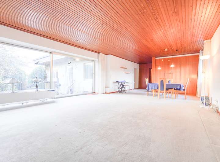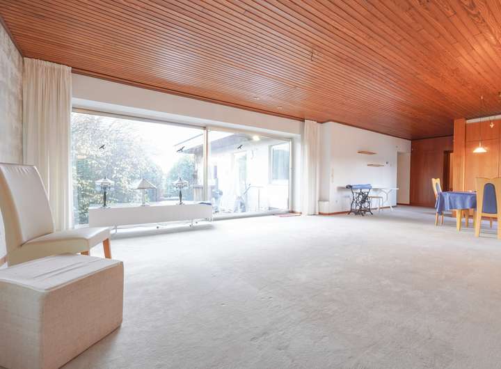 Die Immobilie wurde damals als unterkellerter Winkelbungalow im Stile der Architekten-häuser der damaligen Zeit mit Flachdach erbaut. Später wurde das Dach mit Trapezblechen gedeckt. Im Zuge einer energetischen Sanierung, könnte man mit einem Rückbau des aufgesetzten Daches den ursprünglichen Charakter des Gebäudes wieder herstellen.