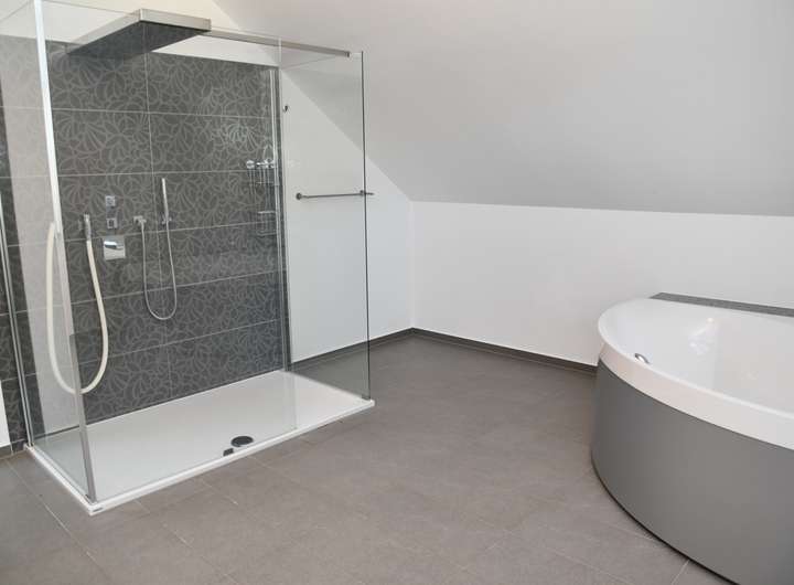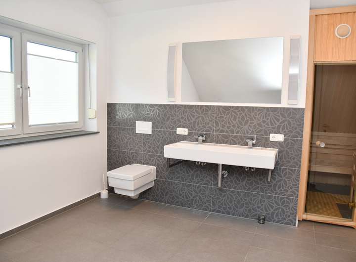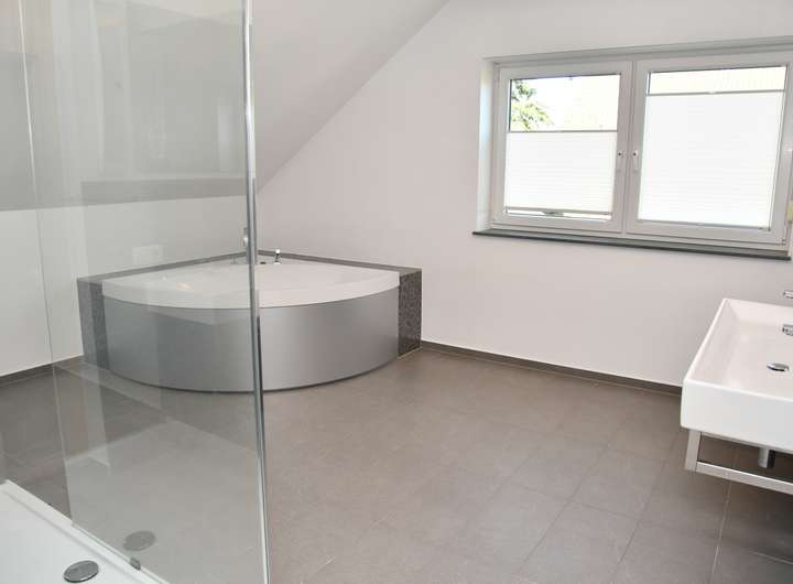 Das zweite Badezimmer befindet sich im Dachgeschoss mit eingebauter Eck-Badewanne, großer ebenerdiger Dusche, einem Doppelwaschtisch und eine Sauna.