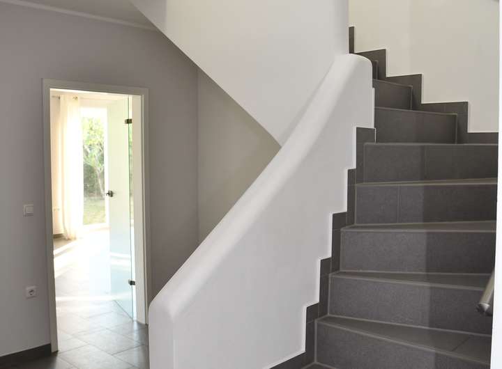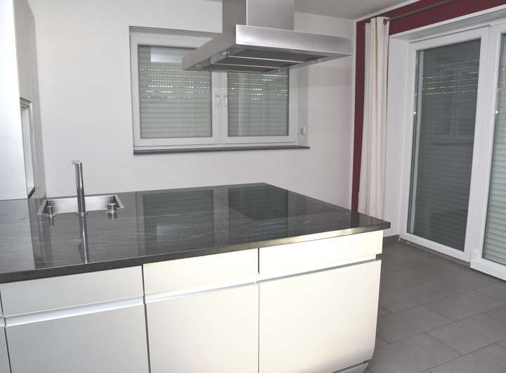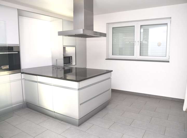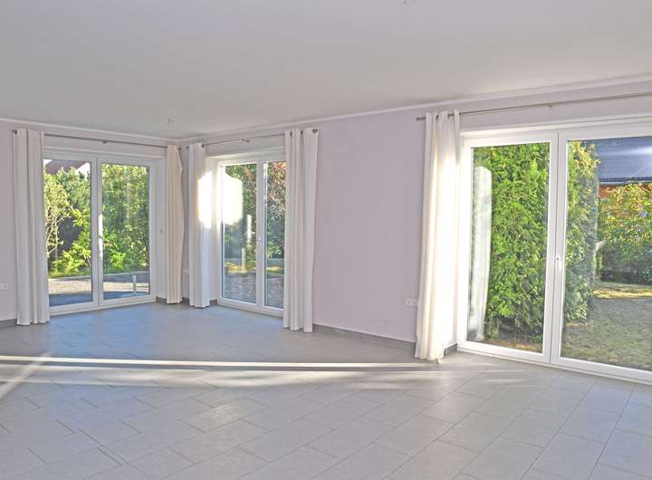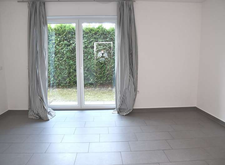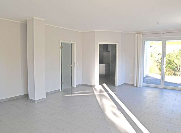 Im Erdgeschoss befinden sich die separate Küche mit direkten Zugang zur Terrasse, das angrenzende großzügige Wohnzimmer, ebenfalls mit Zugang zur Terrasse, ein Bad mit Dusche, ein Hauswirtschaftsraum, ein Bürozimmer mit vorangehenden Durchgangsraum und ein Abstellraum. Im Bürozimmer sind Wasseranschlüsse für den Einbau einer Küchenzeile vorhanden und im Abstellraum sind die Anschlüsse für einen möglichen Umbau zum Bad mit Dusche vorhanden. Die in der Küche befindliche Einbauküche verbleibt im Haus.