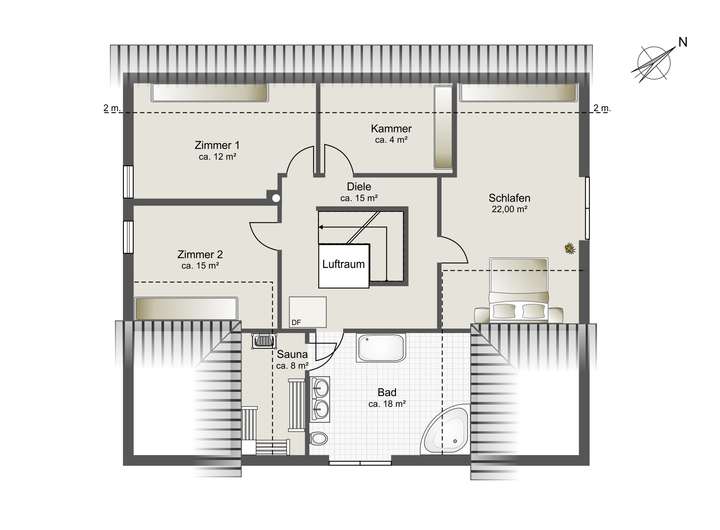 Über den hellen und großzügigen Flurbereich im Dachgeschoss sind die 3 Schlafzimmer und der Ankleideraum zu erreichen.
