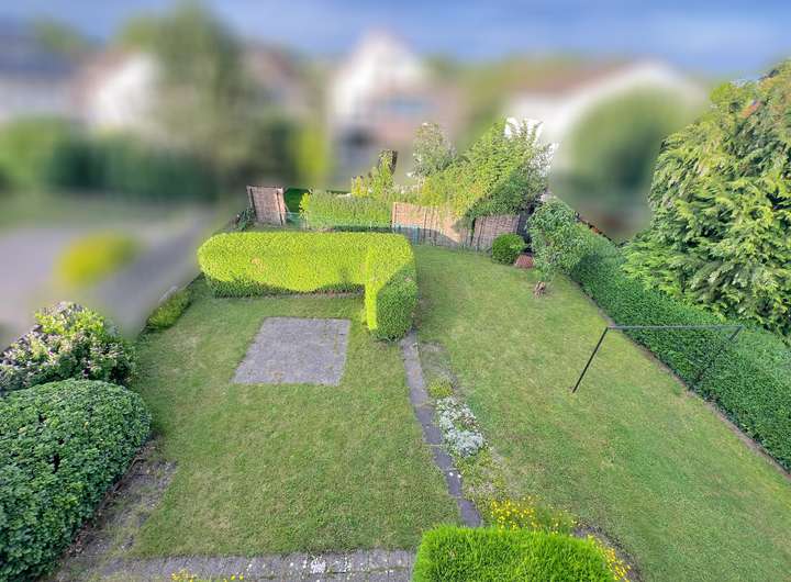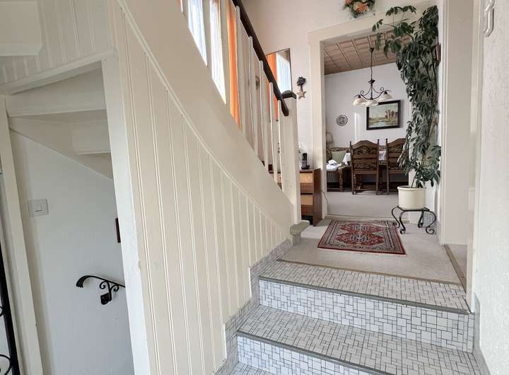 Im Erdgeschoss befinden sich, ausgehend von der Diele und dem Eingangsbereich, das Wohn- und Esszimmer sowie die Küche. Über den Wohnbereich sind die Terrasse und der idyllische Garten zu erreichen.