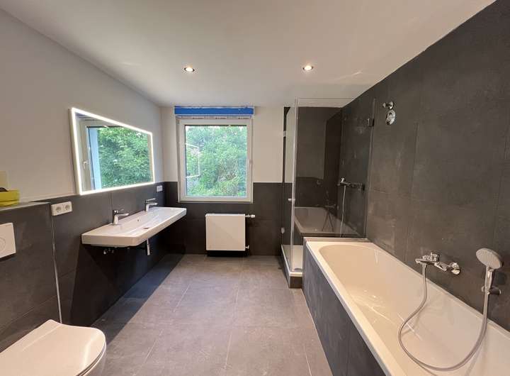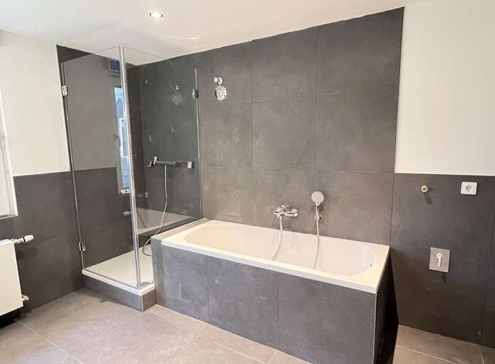 Das geräumige Bad bietet einen Doppelwaschtisch, WC, eine große Dusche (Glaskabine) und Badewanne sowie Anschluss für Waschmaschine und Trockner. Es wurden Armaturen der Marke Grohe verwendet.