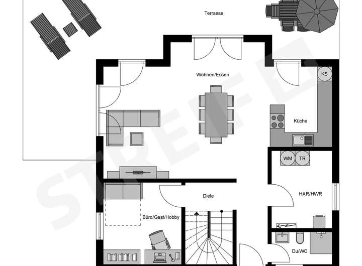 Dieses projektierte Objekt umfasst die Ausbaustufe 3 - FastFertigPlus: mit Sanitär-Grundausstattung. Diese Stufe erlaubt Ihnen Eigenleistungen zu erbringen und somit Kosten zu sparen. Fachbetriebe übernehmen die haustechnischen Gewerke wie Heizung, Lüftung, Sanitär und Estricharbeiten. Wir bieten Ihnen vier verschiedene Ausbaustufen zur Auswahl an und beraten Sie umfassend bei der Planung Ihres Hauses.