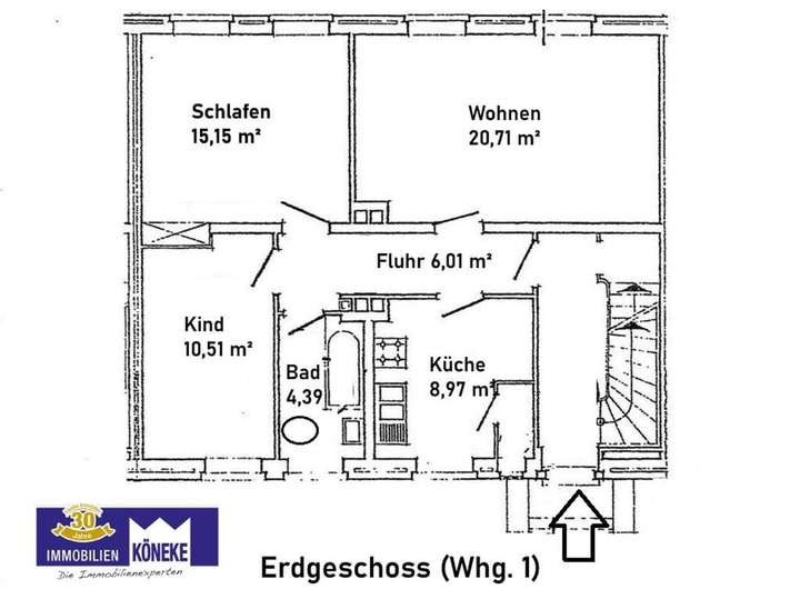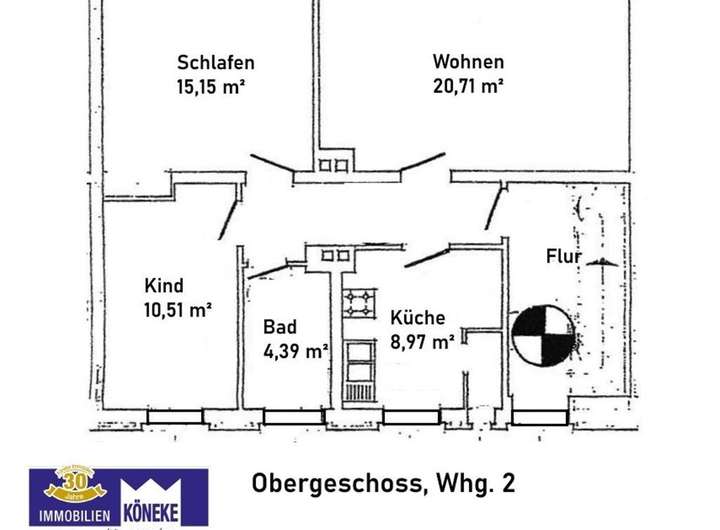 Whg. 2: ca. 65 m² Wohnflächen, 3 Zimmer, Küche, Wannenbad, Abstellraum, Flur, 2 Kellerräume. Die Raumaufteilung und Zuordnung sind den beigefügten Grundrisszeichnungen zu entnehmen. Das Dachgeschoss ist ausbaufähig ca. 22 m².