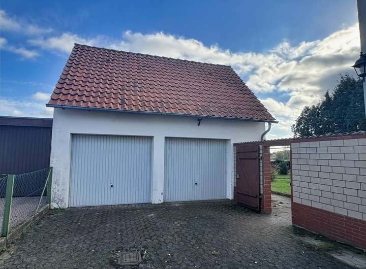 Eine Doppelgarage sowie ein kleiner Schuppen für Gartengeräte ergänzen das Außenangebot.