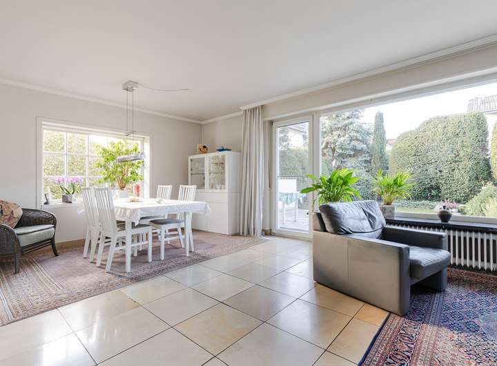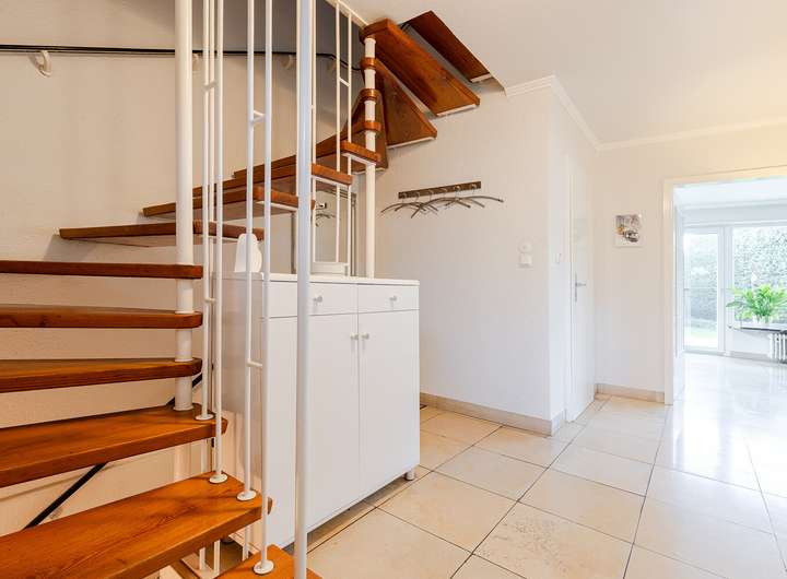 Dieses gepflegte Einfamilienhaus auf einem attraktiven Eckgrundstück überzeugt durch seine helle, freundliche Wohnatmosphäre und eine durchdachte Raumaufteilung. Der Wohnbereich mit einem eigenen Kamin bietet direkten Zugang zum Garten. Die Küche ist vollständig ausgestattet, und ein Gäste-WC ergänzt das Erdgeschoss ideal.