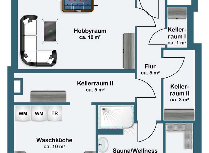 Der ausgebaute Keller bietet hochwertige Zusatzfläche mit Büroraum, Sauna, Dusche und separatem Waschbereich.
