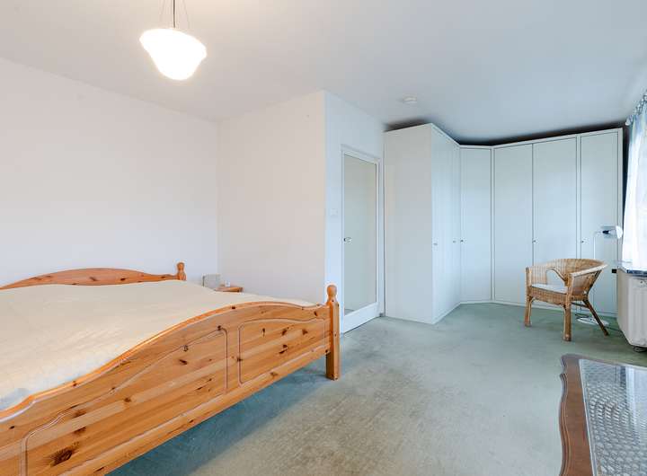 Im Obergeschoss erwarten Sie zwei gemütliche Schlafzimmer, darunter ein Zimmer mit Balkon und Gartenblick, sowie ein innenliegendes Bad. Der Dachboden dient derzeit als Stauraum, kann mit einer Baugenehmigung jedoch zu weiterem Wohnraum ausgebaut werden, wodurch sich die Wohnfläche erweitern lässt.
