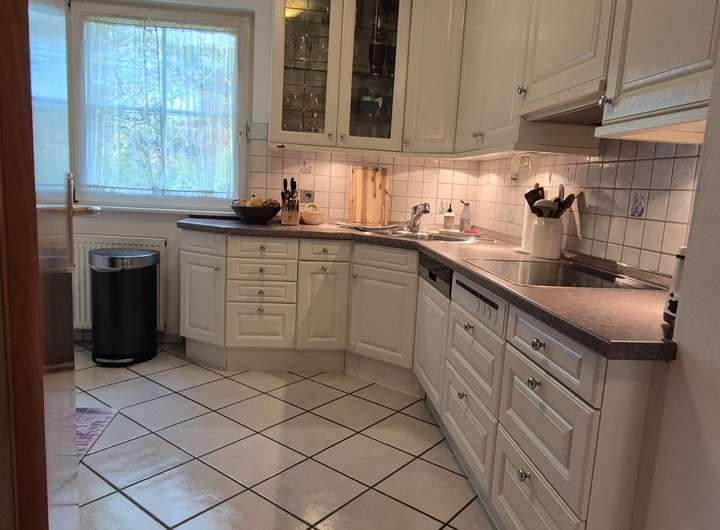 Parkett, Fließen, hochwertiges Lamininat, Einbauküche, Balkon, moderne Ölheizung, Tageslichtbäder. Pergola im großen Garten.