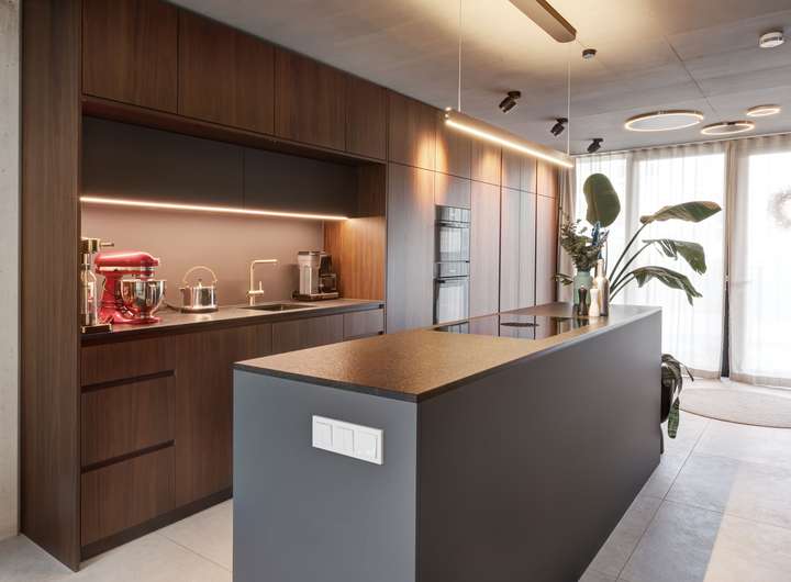 • Maßgefertigte Nussbaumküche mit strukturierter Naturstein Arbeitsplatte und integriertem Stocktürenschrank als separate Coffee Station
