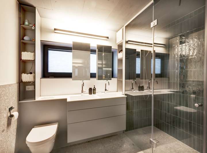 • Hochwertige, übergroße Designfliesen in den Bädern