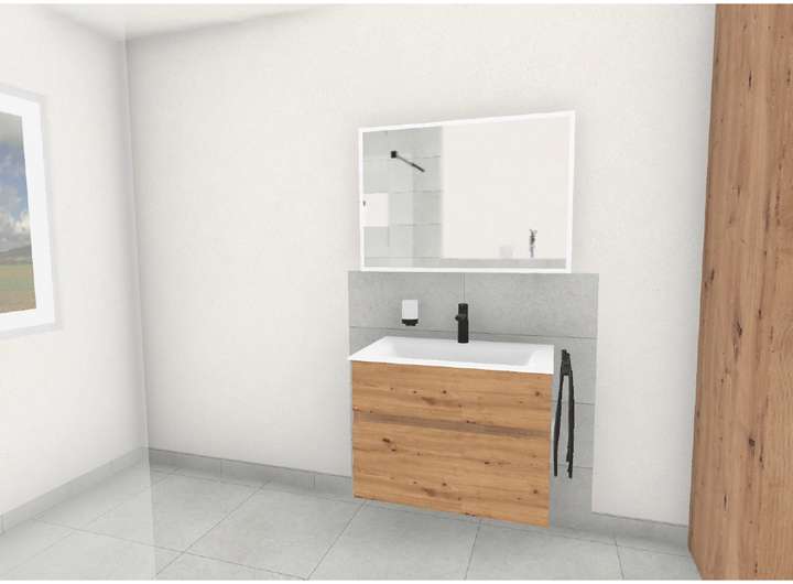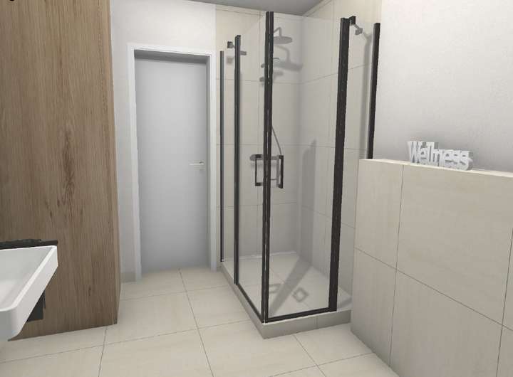 - Boden/Wände/Türen: Designbeläge, weiße Raufasertapeten, neue