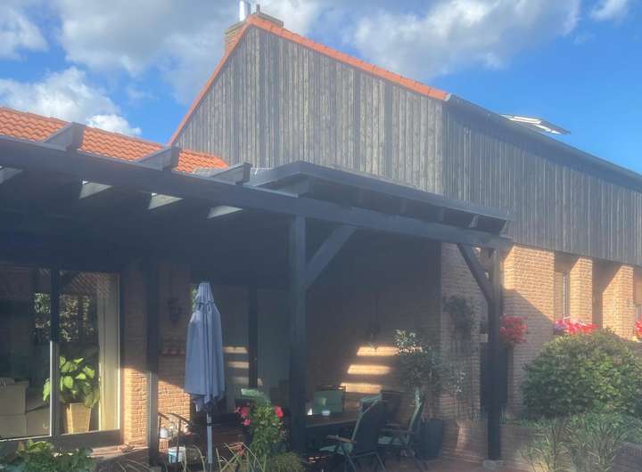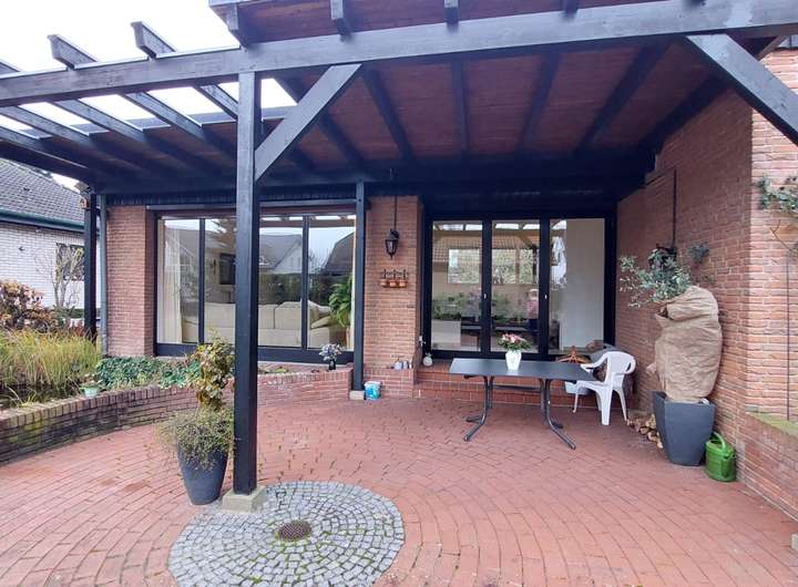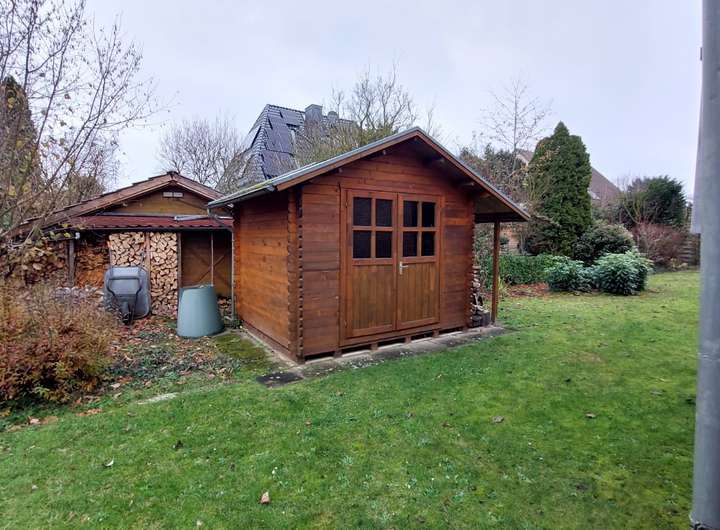 Auf der teilweise überdachten und gepflasterten Terrasse können Sie die Sommerabende genießen und den Blick über den gepflegten Garten schweifen lassen. In einem Gartenhaus finden alle Arbeitsgeräte und Werkzeuge Ihren Platz, ebenso der Holzvorrat für den Kamin.