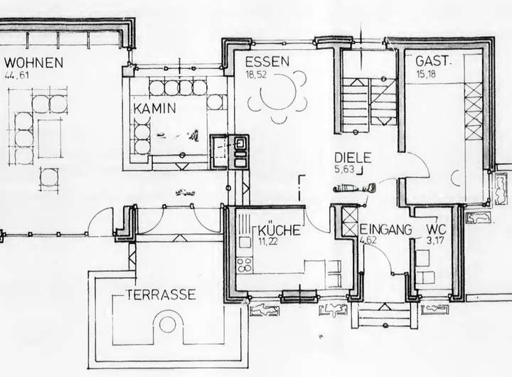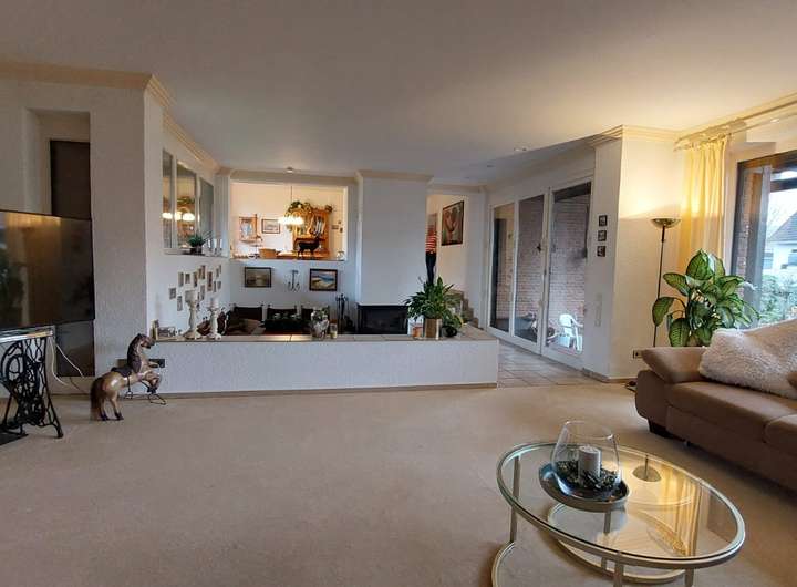Im Eingangsbereich des Erdgeschosses erwartet Sie ein großzügiger Wohnbereich mit abgeteilter Essecke. Von hier eröffnet sich ein faszinierender Blick in das tiefergelegene große Wohnzimmer. Einige Treppenstufen hinab gelangen Sie in den hellen Wohnraum, von dem aus die schöne Terrasse und der Garten betreten werden kann. In einer separaten, etwas niedriger gelegenen gemütlichem Sitzecke mit Kamin, laden bequeme Polster dazu ein, gemeinsam mit Freunden und Familie entspannte Stunden zu genießen. Ein weiteres Zimmer kann individuell als Gäste- oder Arbeitszimmer hergerichtet werden.