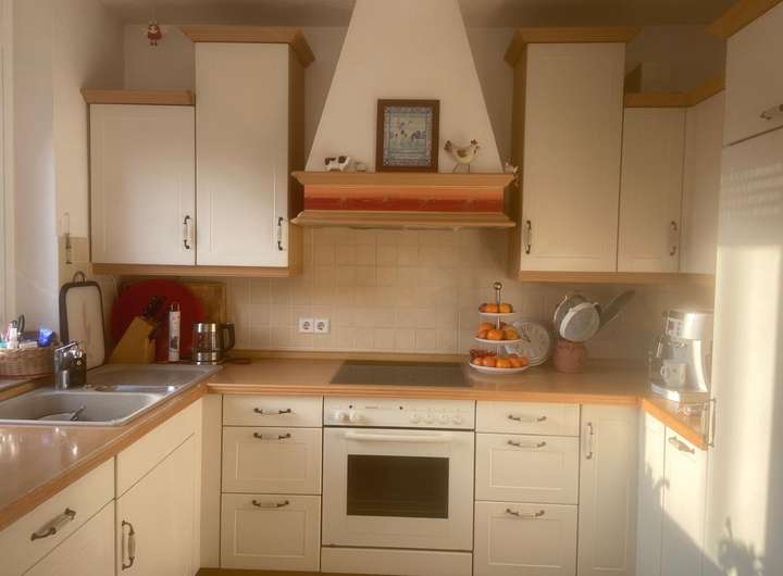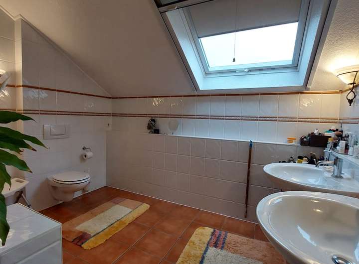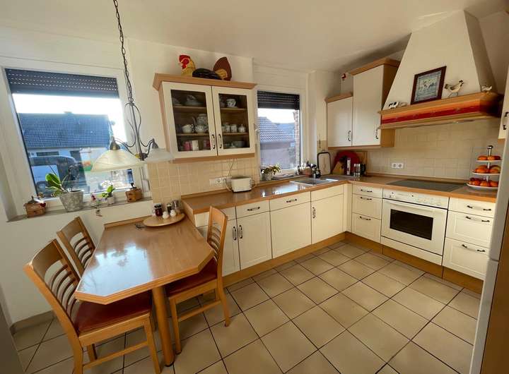 Die praktisch geschnittene Küche bietet genügend Platz, um auch hier mit der Familie eine Mahlzeit einzunehmen. Ein Gäste-WC im Erdgeschoss ergänzt das Raumangebot und sorgt für zusätzlichen Komfort.
