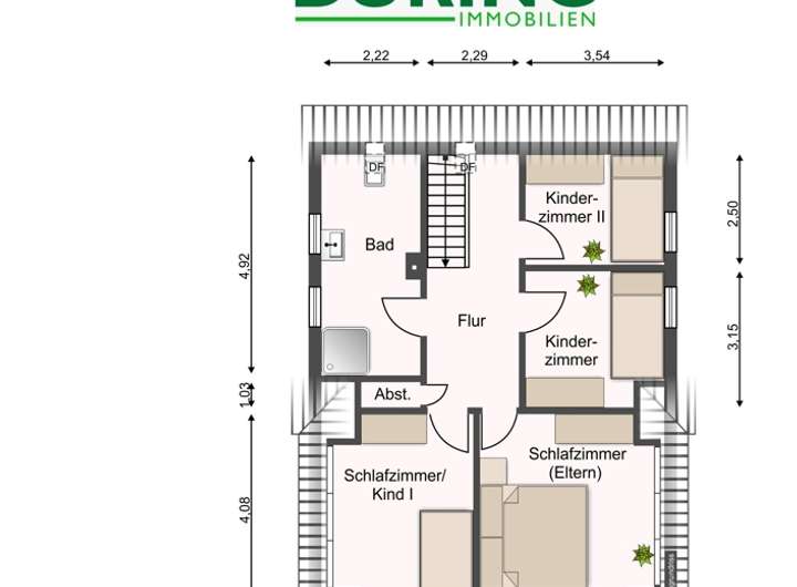 Schlafzimmer (Eltern) // Schlafzimmer (Kind I) // Schlafzimmer (Kind 2) // Flur // Badezimmer (Dusche, Waschbecken & WC) // Abstelkammer - Dachbodenzugang // Büro