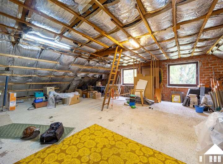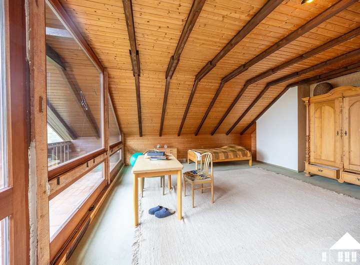 Das Dachgeschoss ist zweigeteilt: Eine Hälfte wurde ausgebaut und beheizt und eignet sich ideal als zusätzlicher Wohn-, Arbeits- oder Hobbybereich. Die andere Hälfte dient derzeit als Bodenraum, verfügt jedoch bereits über vorhandene Anschlüsse und bietet somit weiteres Ausbaupotenzial. Die Dachdämmung aus 100 mm Glaswolle trägt zur energetischen Effizienz des Hauses bei.