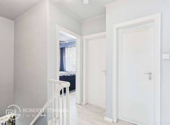 Im Obergeschoss liegen zwei Schlafzimmer – ein großes Schlafzimmer mit Einbauschränken und ein kleineres Zimmer, das sich ideal als Kinder- oder Arbeitszimmer eignet. Auf derselben Ebene befinden sich ein Tageslichtbad mit Badewanne sowie ein separates WC.