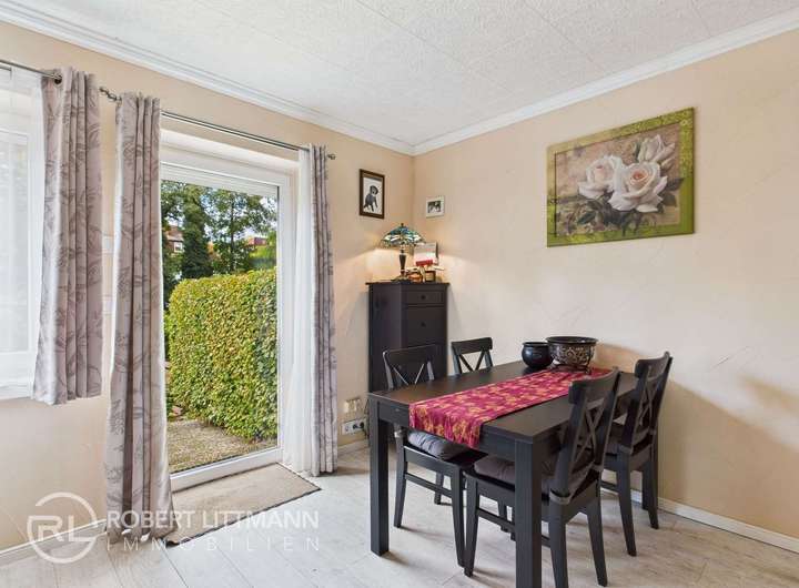 Im Erdgeschoss erwartet Sie ein heller Wohn- und Essbereich mit Zugang zur sonnigen Terrasse und dem gepflegten Garten – perfekt zum Entspannen, Grillen oder Spielen. Die Küche verfügt über eine hochwertige Einbauküche mit durchdachtem Stauraumkonzept und modernen Geräten, darunter ein erhöhter Geschirrspüler für maximalen Komfort. Ein kleiner Abstellbereich ergänzt den praktischen Grundriss.